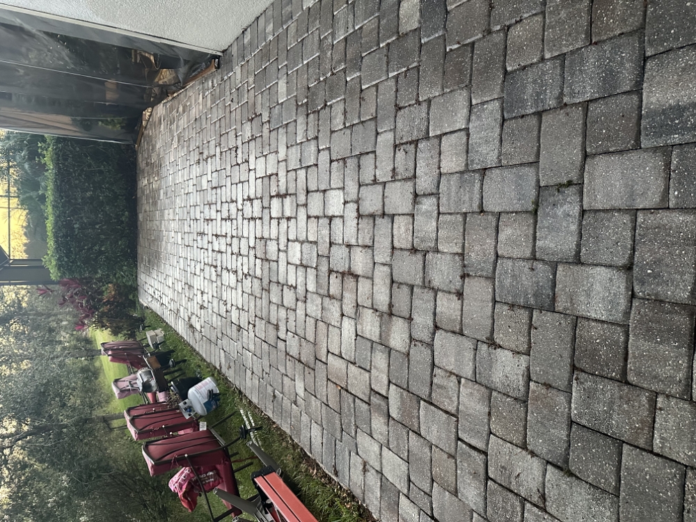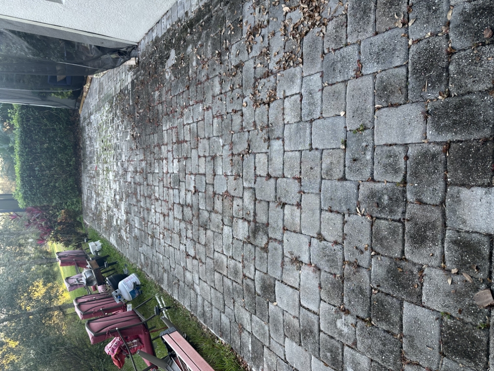 We recently completed a paver cleaning project in Wesley Chapel, Florida, where the homeowner wanted their driveway area and backyard patio to look clean and welcoming again. Like many homes in Pasco County, the pavers had built up dark organic staining, algae/mildew, dirt, and debris in the joints, leaving the surface looking dull and uneven.